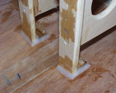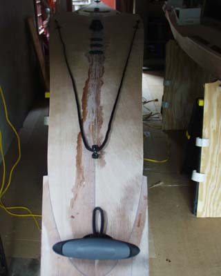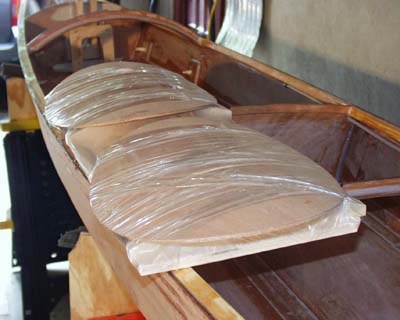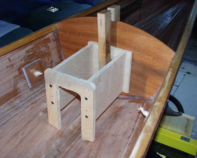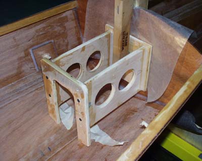 Here the ply sides have been drilled out to save weight, paper tape is holding small blocks in the bottom of the boat for position and the wax paper is preventing the frame sticking to the bulkhead while initial epoxy fillets are applied to the sides and end plates to hold it together. In Alex's Sea Wolf her platform is about half the length and needed only one set of lightening holes.