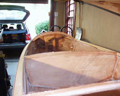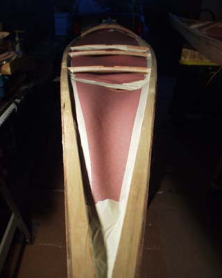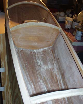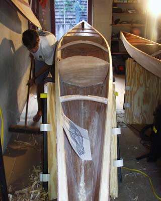 Cleaning up sheer clamp shavings, sanding out the inside of the boats prior to varnishing. We had thought to put some bow art on the boats and the bit of paper in the bow is an enlargement of an Inuit polar bear carving. But more research showed the Inuit basically did not decorate the skins of their boats - instead decorating the fittings which were made of bone. In the end we did not decorate the boats.