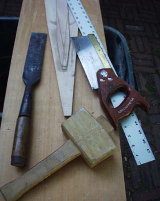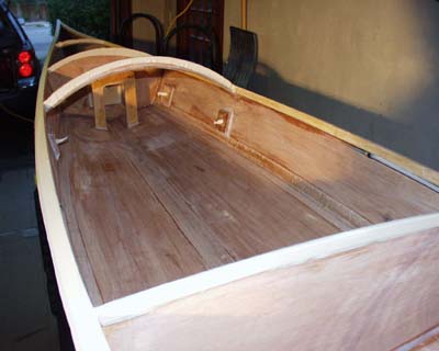 With the interior varnished with 4 coats of varnish (3 gloss - a light rub back and final coat of satin varnish) I got around to dry fitting the decks. I had goofed the measurement of the taper on the butt strip on the deck panels and had to take them back a bit. Roy might recognize that nice big bung chisel on the left. I bought it on a stand at the Wooden Boat Show just before I went over to his stand. I finally hid it in the grass so I would not drop it on one of his sample boats at the show! I did remember to pick it up and bring home.