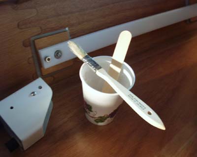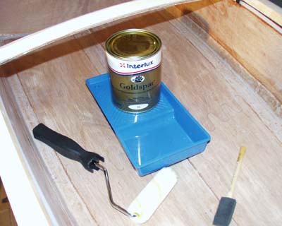 We varnished with a one pot polyuerethane quickly rolled on with a 4" roller and quickly tipped off with a foam brush. Total time to varnish two interiors by this method - 35mins per coat. For really high performance you might want to use a two pot polyuerethane. If you read the Personal Safety section you will see I do not believe many home builders are adequately equipped to use two pot paints and varnishes safely. The iso-cyanate gases given off during use and cure are life threatening over a period. In my time in the yacht industry I have seen enough of the long term effects. I don't have air fed hoods and a compressor - I stuck with one pot.