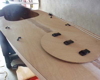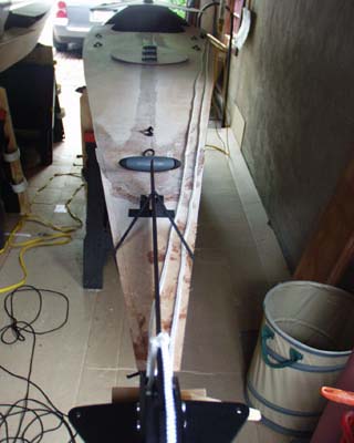 With the deck panels sitting on top of the boats we measured and marked positions for the deck fittings. As I was adding lifelines and toggle carry handles I had extra fittings and I decided that although the webbing loops for the deck bungee cord were OK - I was going to use deck eyes (even if they hurt a little more in a rescue and can potentially "ding" the boat) because they are less inclined to rip in a tough rescue. Adding the lifelines meant that the rudder lines would need releading so this exercise is worthwhile while everything is dry and can be relocated with a pencil mark.