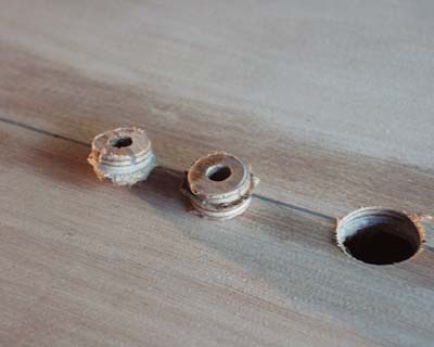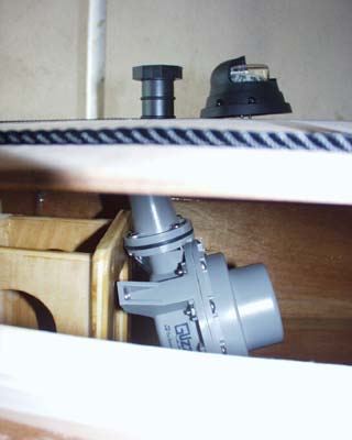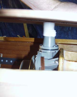 A temporary soft white piece of PVC pipe will help us with final alignment of the pump exit hole relative to the pilot hole in the deck.