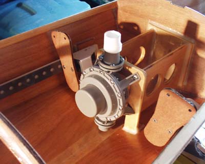 OK - this is the ONE bit of the build manual I really did not agree with. The termination of the inner rudder tube end at the bulkhead. The small brass tube does not offer much in the way of an effective gluing areas to the thin bulkhead. As plenty of polythene pipe had been provided - I brought the pipe through the bulkhead all the way to the maximum beam of the boat and held it in place with a couple of extra "P" clips. The hole at the bulkhead was ultimately sealed with 3M-5200 Polyurethane adhesive sealant which sticks to the pipe much better than epoxy. You can also see the finished epoxy fillet that holds the bulkhead in place in this shot.