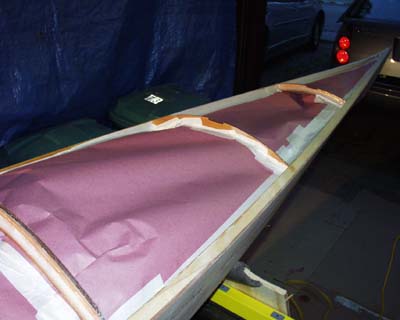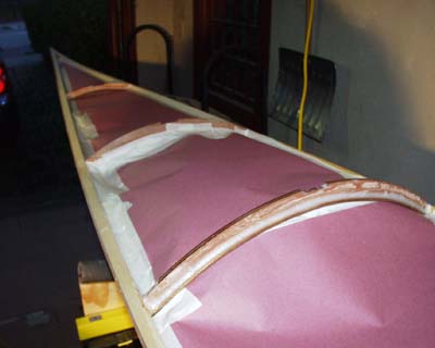 Decking is messy and epoxy will drip into the boat - ruining the beautiful finish you put on it! We completely masked the inside ot the boat leaving only the top face of the sheer clamp exposed and the tops of the "I" beams. It takes a little time but pays dividends in reduced clean up later..