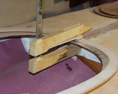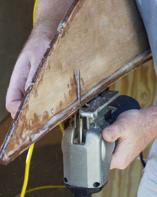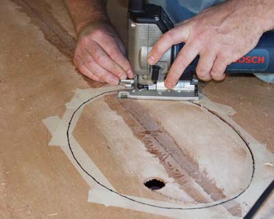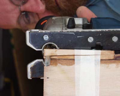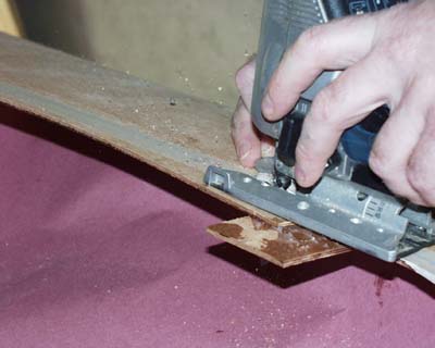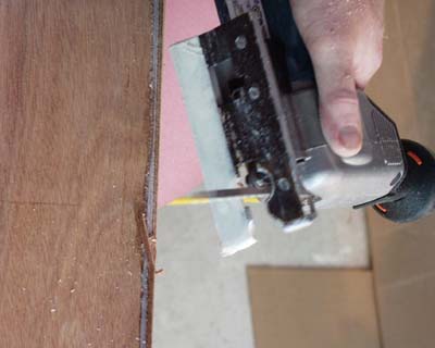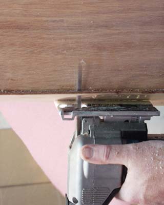 Because you want the blade running parallel to the side panel and the deck is a constantly changing angle you cannot reasonably set the foot plate of the jig saw to the deck angle and will end up holding it in place. This is OK as long as you have at least the edge of the saw foot plate is firmly held up to the deck. But the edge of the foot plate tends to gouge the thin ply so...