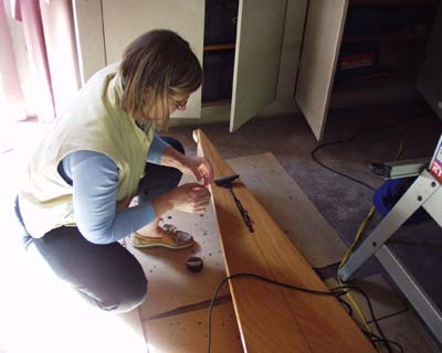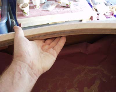 Fitting the rub rail. We bedded it down on thickened epoxy and found that masking tape was enough to firmly hold it in place instead of the hot glue gun method in the manual. Even the bent tip on the bow could be pulled with tape - though it helped that we had tapered the rail at the bow to a point.!