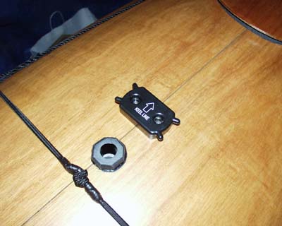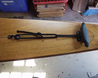 ....we taped around the through hull and the pump spigot with layers of amalgamating tape (sold in some places as "Rigging Tape"). When the tape had set up and made a pipe we hose clipped it in place on each spigot. Servicing the pump will consist of drawing out the four screws holding the pump to the pump platform and then slicing through the pipe to get the pump out. Note rudder lines are rigged. We dispensed with the adjuster lines on the adjustable foot pads. We found we could reach in just fine by hand and the string just plain got in the way.