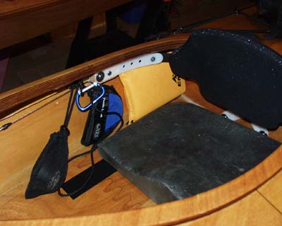 We fitted NSI anatomic touring seat backs (see Links section). Also stowed in each cockpit is a pouch for the compass, a sponge on a leash, and a paddle leash stowage pouch. Hip pads will follow once we have been on trials. (they did - on velcro like the seat to allow them to be adjusted slightly) . So on to Trials....>>